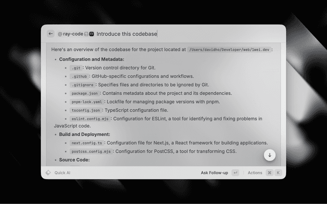 Ray Code is a Raycast extension designed to turn AI chat into a local-first coding agent. It wraps common filesystem tasks in a safe, workspace-aware toolkit so you can drive development workflows with natural language while staying productive on the desktop.