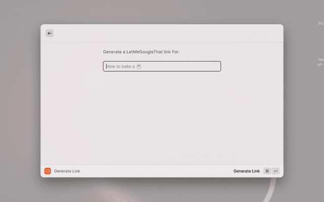 With LetMeGoogleThat, you can generate custom links to the popular 'Let Me Google That For You' website with just a few keystrokes. Simply type in your search term, hit ⌘⏎, and voila - you've got a link that takes your friend directly to a Google search page for their query.