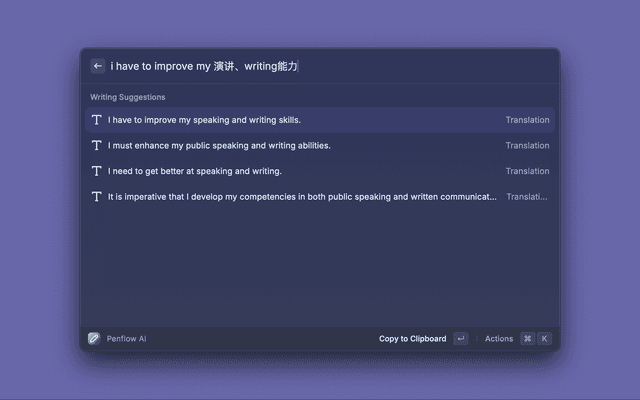 • This tool aims to encourage writing in English, allowing mixed Chinese-English input when needed, while providing completion, translation, and refinement capabilities to lower the barrier of native English writing