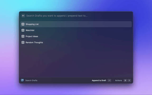 To configure a Draft you need to copy its UUID in Drafts from the Info Menu of the Draft. You can choose a title that should be displayed in Raycast for this Draft and select if you want to prepend or append text to that Draft.
