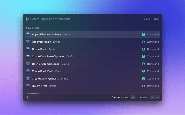 Depending on your configuration Raycast will ask for text input you want to provide to the Drafts Action or run the Action without any text input.