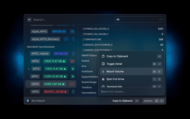 The usage is fairly intuitive. Each disk has multiple actions in Raycast which are self-explanatory and change based on the type and status of the disk/volume. Just try it!