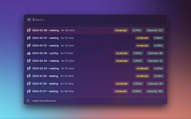 - Get your latest workouts - Get your latest logged activities from Oura; either automatically logged or from outside sources