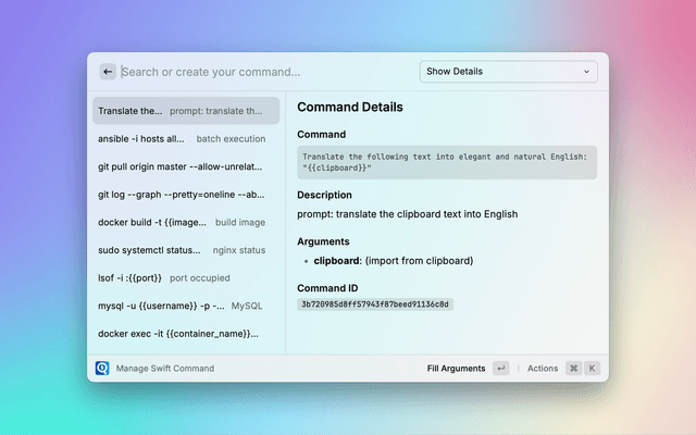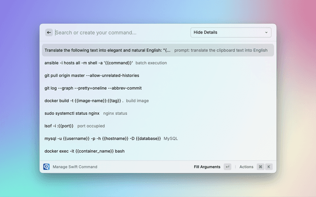• Import aliases from your shell configuration files (supports .zshrc, .bashrc, and fish config)