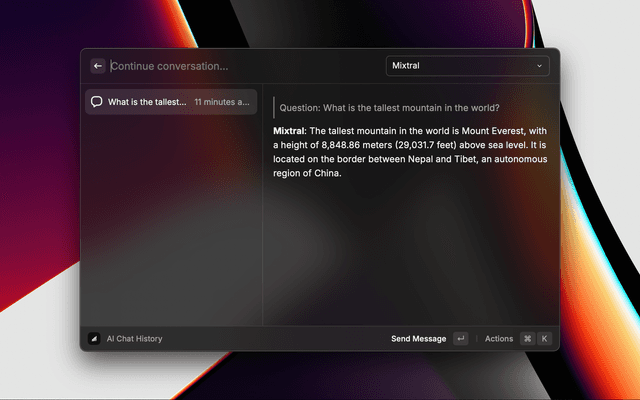 Chat with a variety of models hosted on the bittensor network. AI chat featues: Getting responses from different models while preserving context, a locally stored chat history, copy/paste question and answer, chat deletion etc.