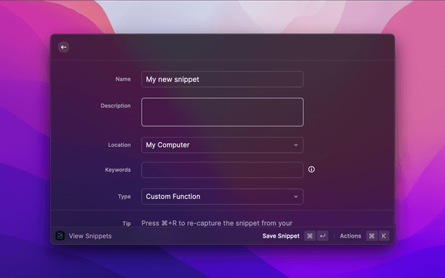 To create a new snippet, copy something to the clipboard from FileMaker. This can be a script, script step, layout objects, field definitions, etc. Then use the "Create Snippet" command and fill out the form to give the snippet a name, description, and optional keywords.