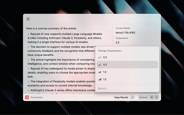 Groq's API offers a wide range of AI models, such as Mistral, Google and Meta's Llama models, with insanely fast speed (Llama3 70B with over 250 t/s). With this powerful extension, you can boost your productivity using advanced AI models without having to leave your Raycast interface.