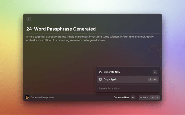 • Passphrase Generation: Generate 24-word passphrase, automatically copied to clipboard