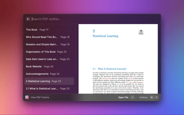 The View Outline command allows you to open a selected pdf file and view/filter the different sections of the selected PDF file.