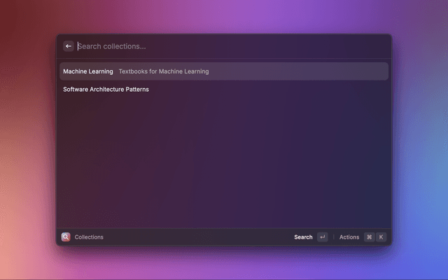 Raycast extension for performing search across groups of selected PDF documents. It uses PDFKit to perform keyword search for all files within the collection, extracts the paragraph the matches are contained in, then reranks the paragraphs based on its semantic similarity with the search query.
