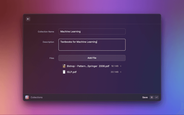 Create a collection by naming and selecting a group of PDF files/directories from finder, which can also be removed from the collection. You can also edit existing collections. Note that collection names have to be unique.