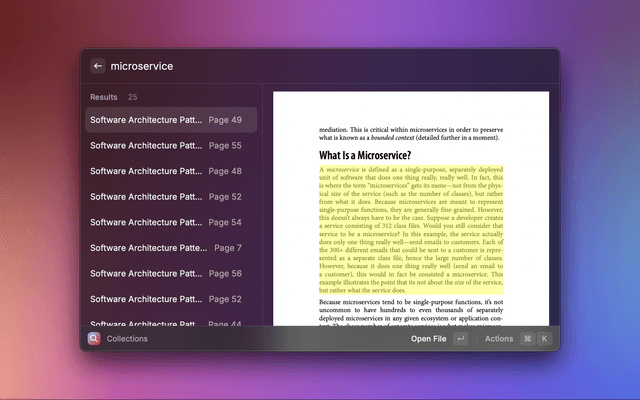 When a collection selected, you will be brought to a page where you can enter your search query, which will be used to search all files within the collection. Selecting any of the results will open the PDF document and navigate to the page that contains the query at the location that matches. You can also preview the document using quick look, or show the file in finder.