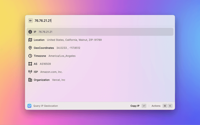 Show local and public IPv4/IPv6 address. Query geolocation for any IP address or domain.