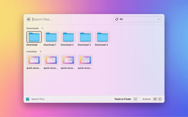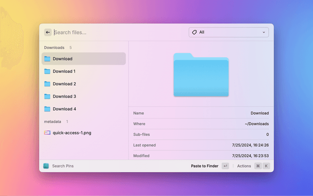 For example, if you pin Downloads folder. You can use "Search Pins" command to quickly drag and drop or open/copy/show/paste the image you downloaded from browser. Alternatively, you can use the Menu bar command to quickly open/copy/show/paste pinned files or folders in the menu bar.