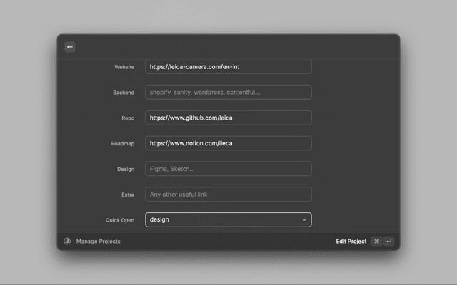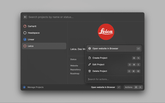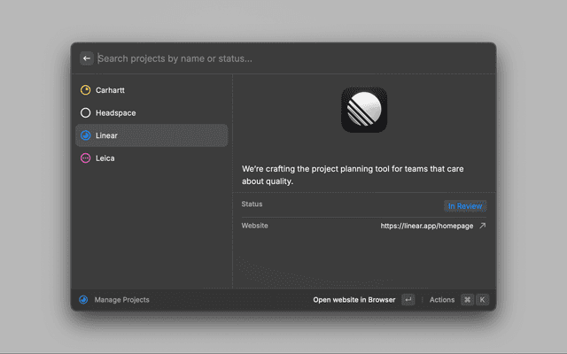 The Project Companion Raycast Extension allows you to manage your projects directly from Raycast. Use it to store project information like name, description, status, and links.