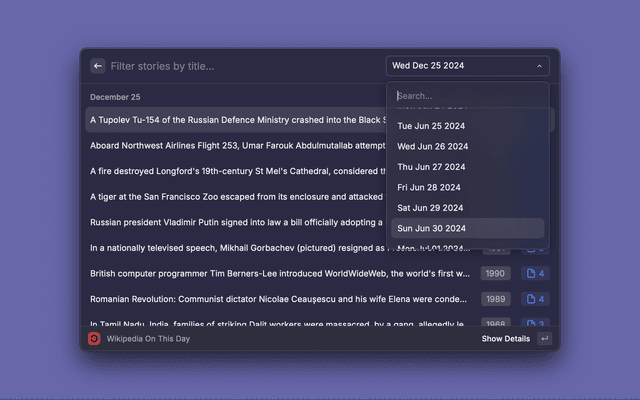 • Date Selection: Choose a different date from the dropdown to explore events from any day in history.
