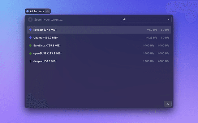 A powerful Raycast extension to manage your qBittorrent client directly from Raycast. This extension allows you to control your torrents without leaving your workflow.