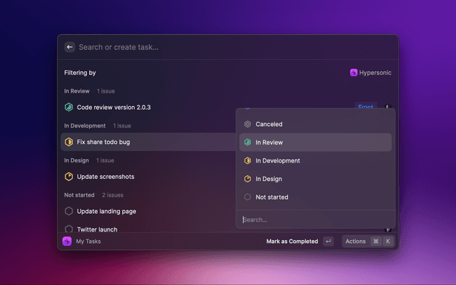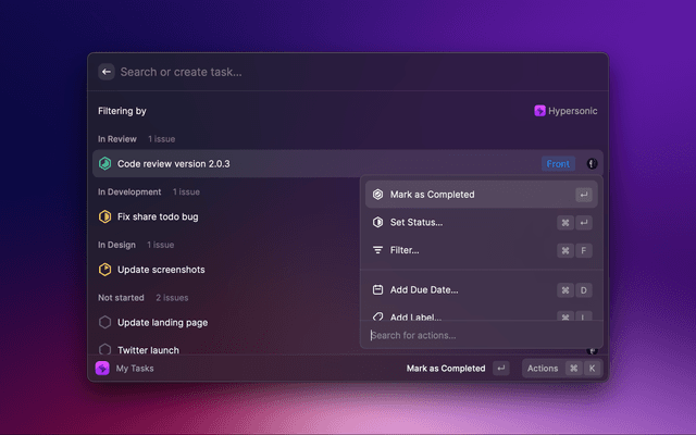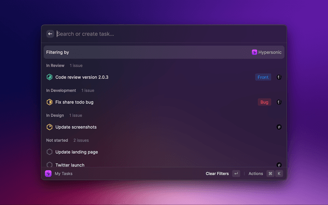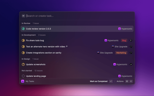 You can manage your tasks faster than ever in Hypersonic. We use natural language recognition to separate the task from its metadata, so you just need to type.
