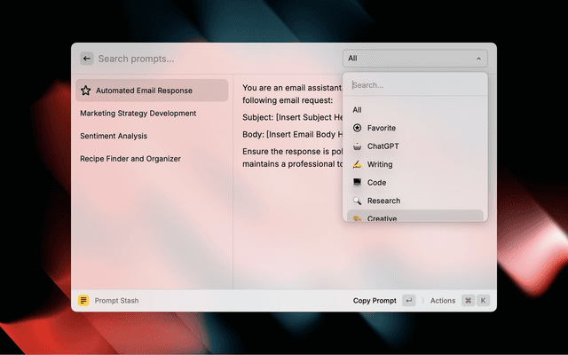 Prompt Stash is a Raycast extension that helps you manage your AI prompts efficiently. Whether you're working with ChatGPT, Claude, or any other LLM, Prompt Stash makes it easy to save, organize, and reuse your most effective prompts.