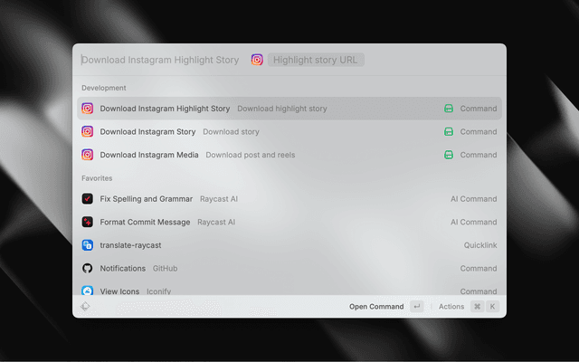 • Speed and Efficiency: Enjoy a fast and user-friendly interface within Raycast, allowing you to obtain your media quickly without delay.