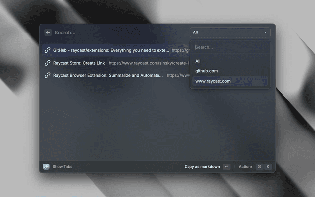 The Create Link extension for Raycast allows you to effortlessly copy the current browser URL in various formats. Whether you need a plain text link, an HTML anchor tag, or a Markdown link, this extension has you covered.
