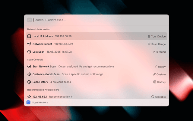 A powerful Raycast extension to scan your local network, detect assigned IP addresses, and get smart recommendations for available addresses to prevent IP conflicts.
