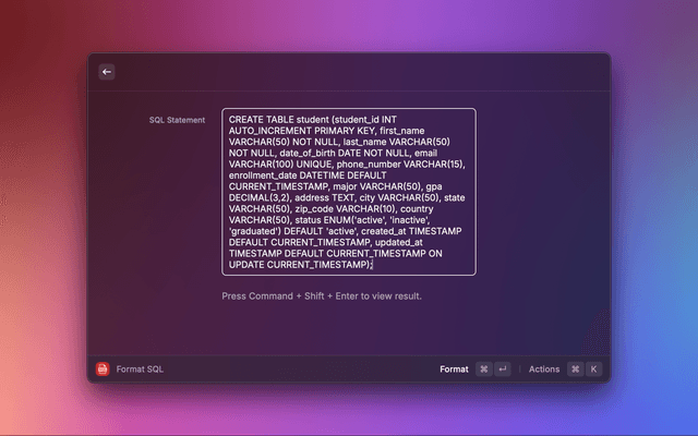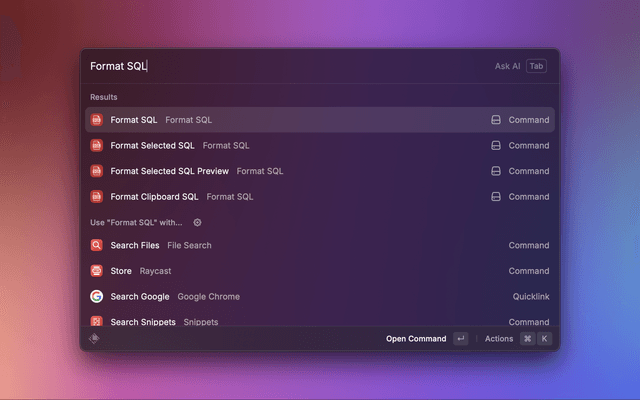 This extension is used to format SQL clause in Raycast created by @tonngw