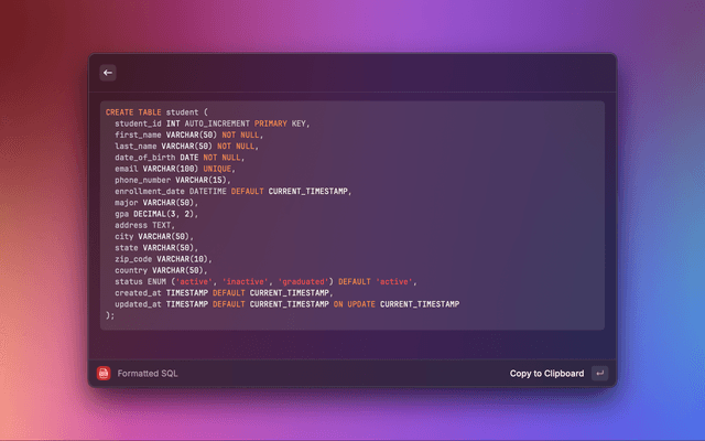 • Preview formatted SQL with a visual interface and copy/paste options