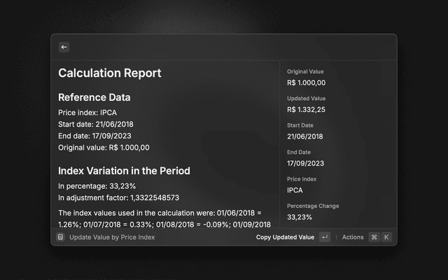 • Update Value by Financial Index: Update a value based on a variety of Brazilian price indices.