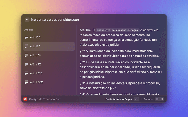 The Vade Mecum extension for Raycast provides a quick and efficient way to access and navigate relevant Brazilian legislation.