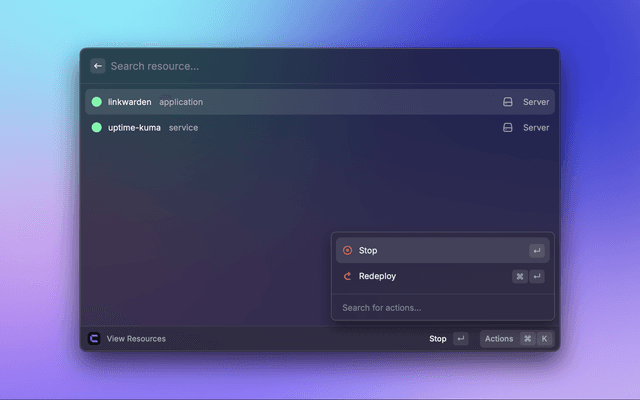 This is a Raycast extension for Coolify - An open-source & self-hostable Heroku / Netlify / Vercel alternative. With this extension you can view Servers, Server Details, Resources, Teams, Team Members, Projects, Environments, Private Keys and more in your Coolify instance.