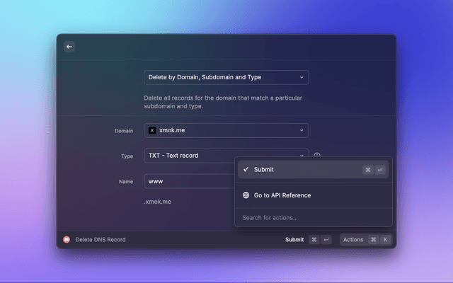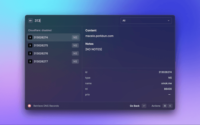 This is a Raycast extension for Porkbun. With this extension, you can fetch latest domain pricing and create, list, edit or delete DNS records, URL Forwarding and Name Servers for API-enabled domains in your account.