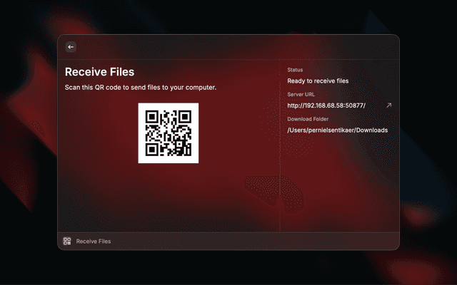- Receive Files: Scan a QR code from your mobile device to upload files directly to your computer.